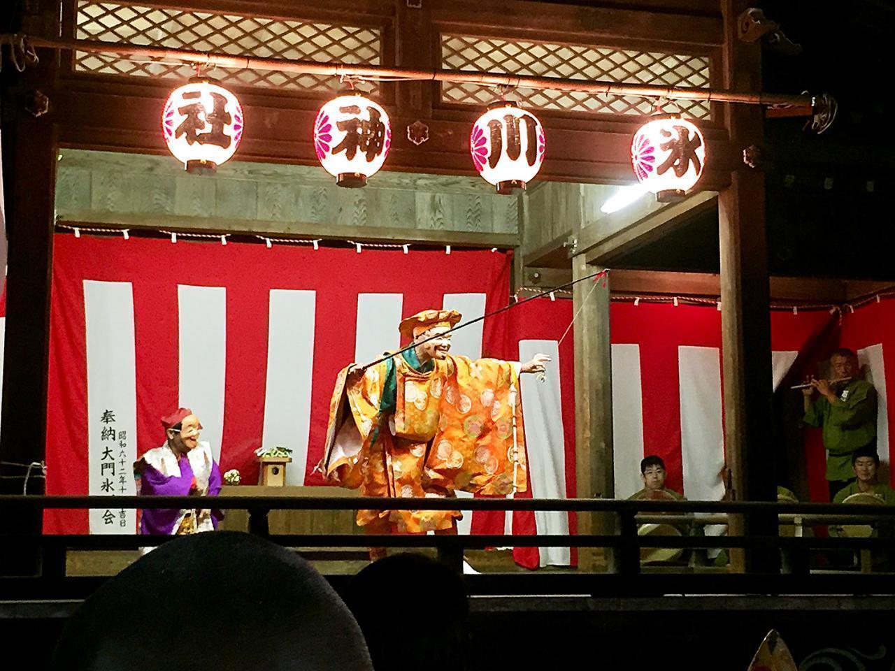 宵宮のお囃子の様子。大黒天が釣った鯛から出てきたお菓子は子どもたちに振る舞われます