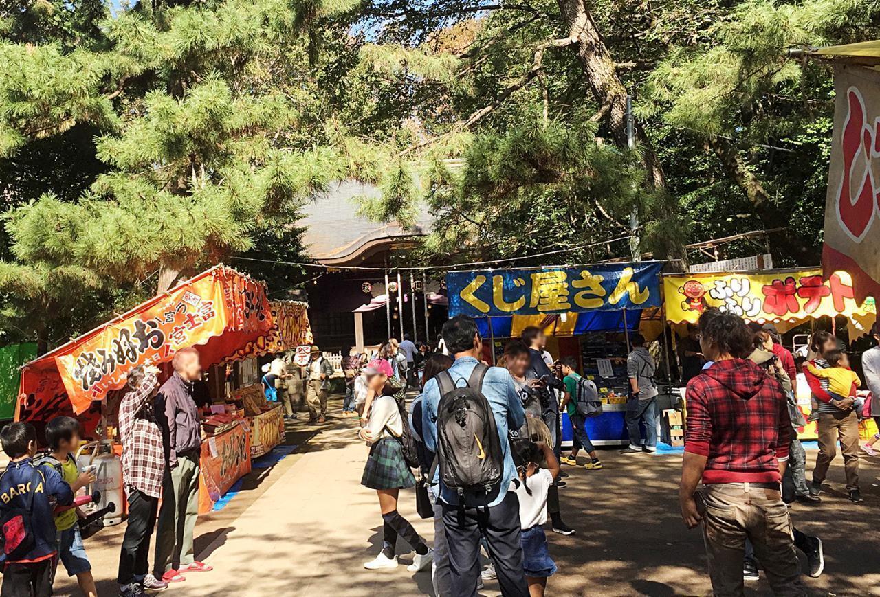 境内には、昼過ぎから約30店の露店が並び、お祭りならではの食べ物等が楽しめます。明るいうちは神楽殿のお囃子を、夜は参道に飾られた行燈の幻想的な風景を楽しんでみては。ただ、毎年夕方から夜の時間帯は大変混み合うので、子連れの方はお昼頃に行くのがおすすめです。