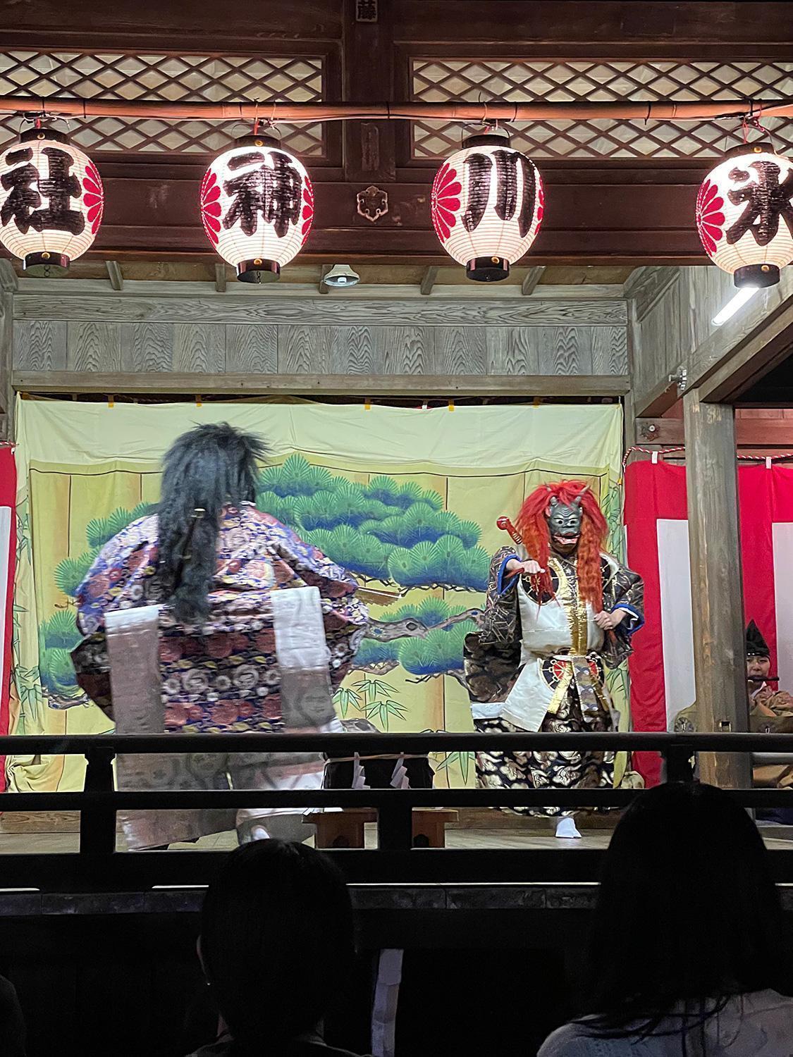 日曜日の14時から、4人の巫女が神様に奉納するために社殿で披露する巫女舞「悠久の舞」は必見! その後、神楽殿において「石山社中」による「武州里神楽」が奉納されます。演目はいくつかありますが、笛や太鼓などの演奏に合わせ、コミカルな所作を交えながらストーリーが進んでいくので、お子さんでも楽しみながら練馬の文化に触れることができます。